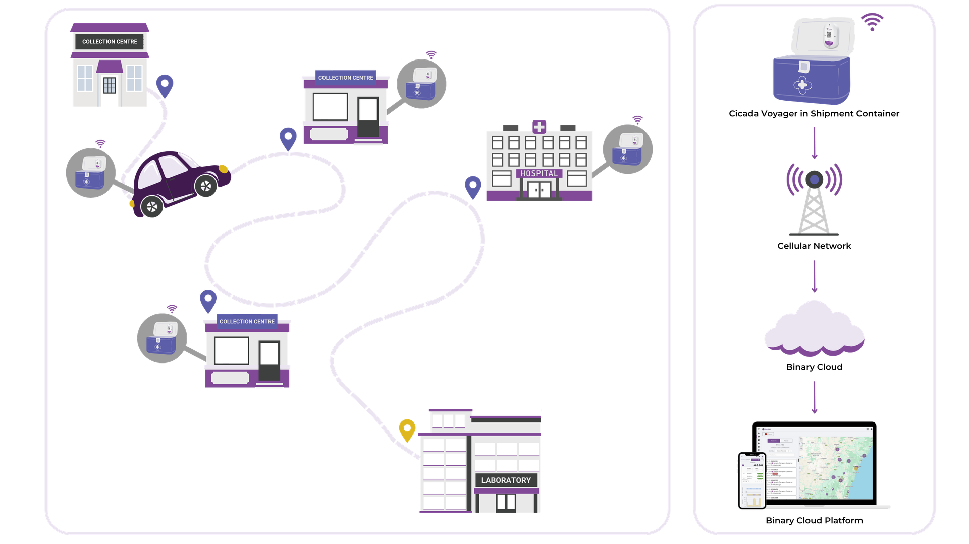 The Binary Cloud integrates data collected from Cicada Voyager devices, giving you complete visibility of samples in transit. This cloud-based platform is accessible from any web browser and requires no app installations or downloads.
